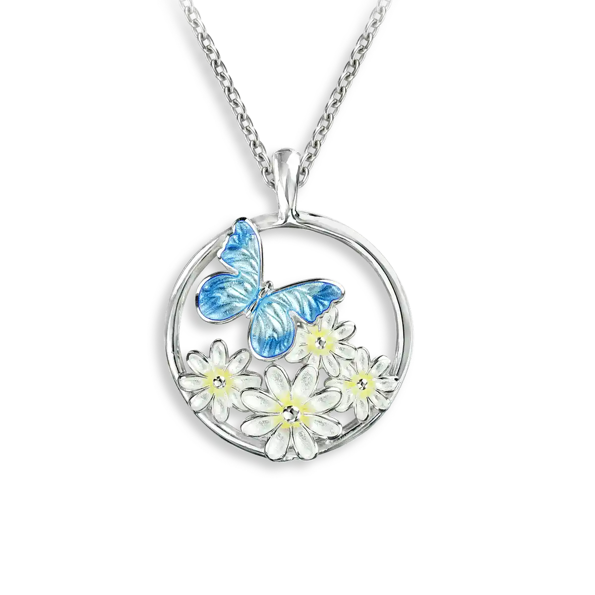 Blue Butterfly with Daisies Necklace. Sterling Silver