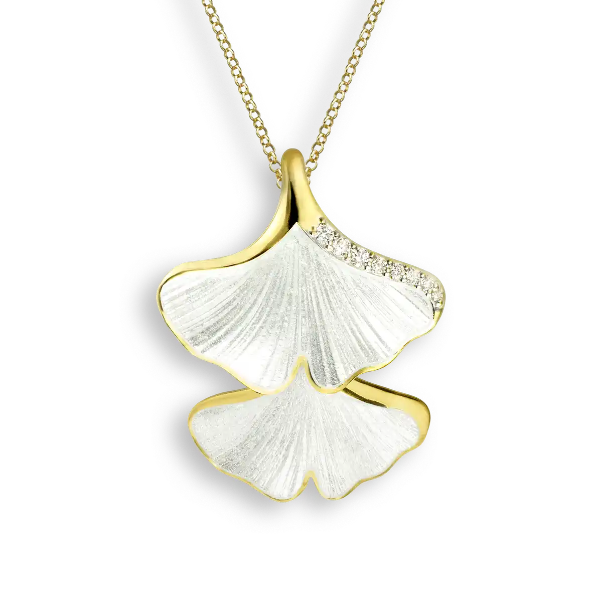 Silver.Gold Plated White Ginkgo 2-Leaf Pendant. -Diamond